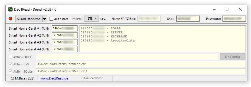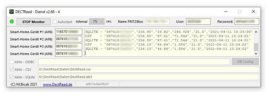 Mit START Monitor liest nun Dect!Read - DIENST im vorgegebenen Takt das/die AIN Gerät(e) aus, so sollte das ganze dann aussehen: