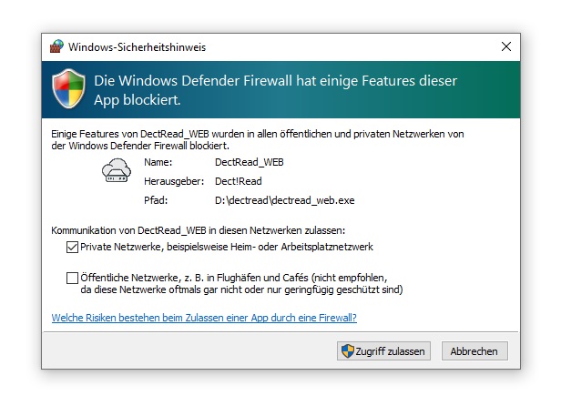 Installiert auf einem Systemlaufwerk benötigt Dect!Read - WEB SERVER / DIENST auch beim ausführen Adminrechte.